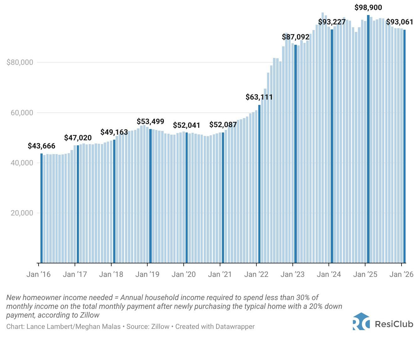 4. Charted: Household income needed to afford the financed purchase of a typically valued home